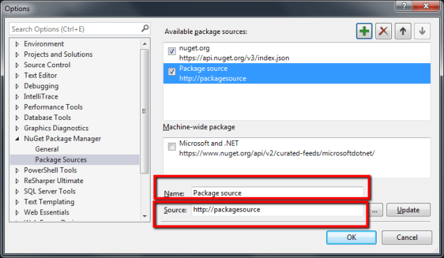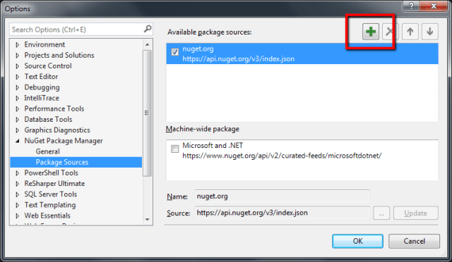 - From the option window expand Nuget Package Manager option and select Package Sources. This will option will show the available package sources form where Visual Studio will get the nuget packages. Click the Add button “+”.